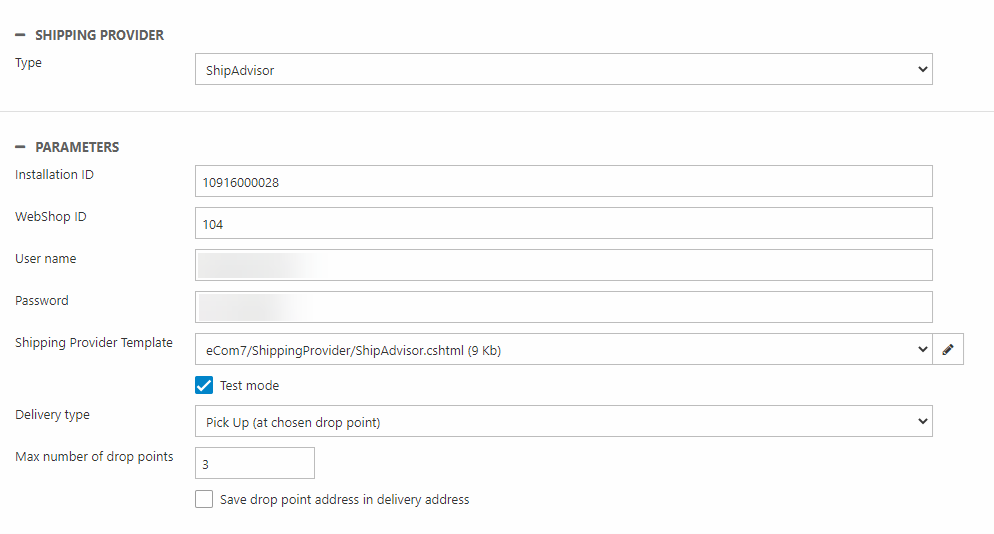 First supply the basic parameters associated with your nShift/ShipAdvisor account – Installation ID, Webshop ID, User name and Password.