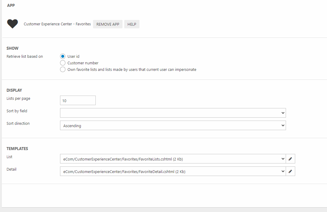 The Customer Experience Center – Favorites app is a frontend app for rendering Favorite Lists related to a particular user or user group in frontend. As such it is a faster and more streamlined parallel to the MyLists-part of the older Customer Center app. It is exclusively made for ViewModel templates.