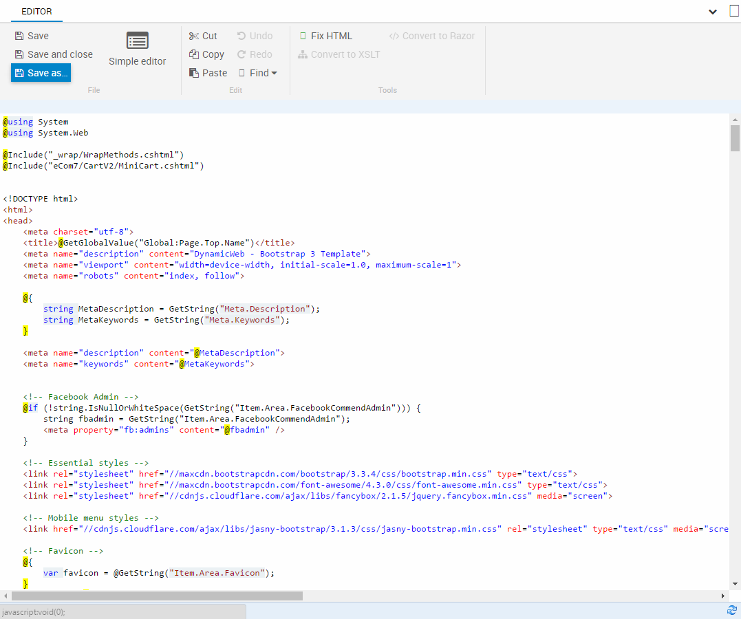Dynamicweb features a built-in text editor with some code highlighting. It is launched when a text-based file is edited via the Files area or when the Edit button on a template selector elsewhere in the system is clicked.