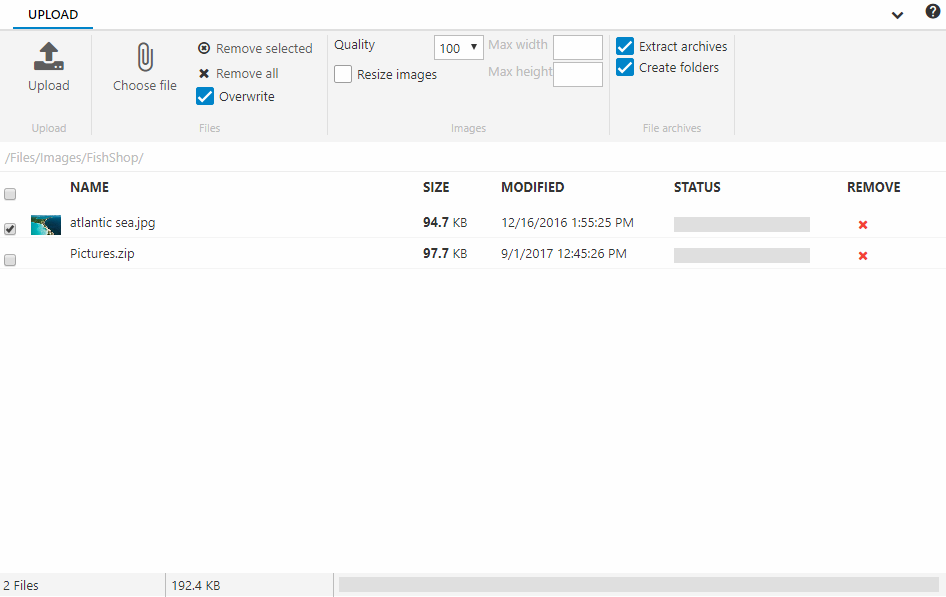 Dynamicweb features an Upload Manager tool (Figure 1.1) which supports more advanced uploads - like unzipping files on the go. It is primarily useful when you cannot access the server where the solution is located directly, but still need to do more advanced upload tasks.
