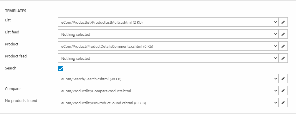 The Templates section (Figure 5.1) controls which templates are used to render product catalog data in frontend.
