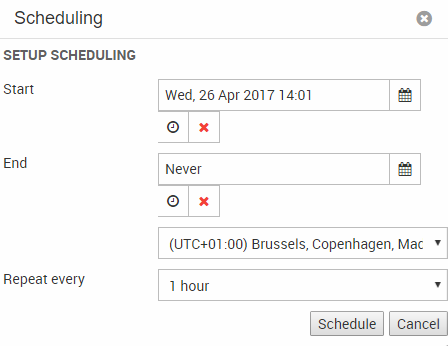 - Select a start date and time and an end date and time. If you want to let the campaign run for an unlimited time, select never as the end year.
