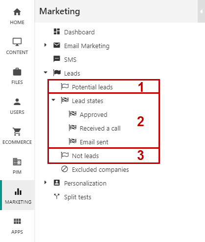 When managing leads, potential leads are marked as either leads or not leads. When you save these changes, these potential leads that have been marked as Leads or Not leads will be removed from the Potential leads category in the Marketing tree and are now accessible from the other categories (Figure 3.1).