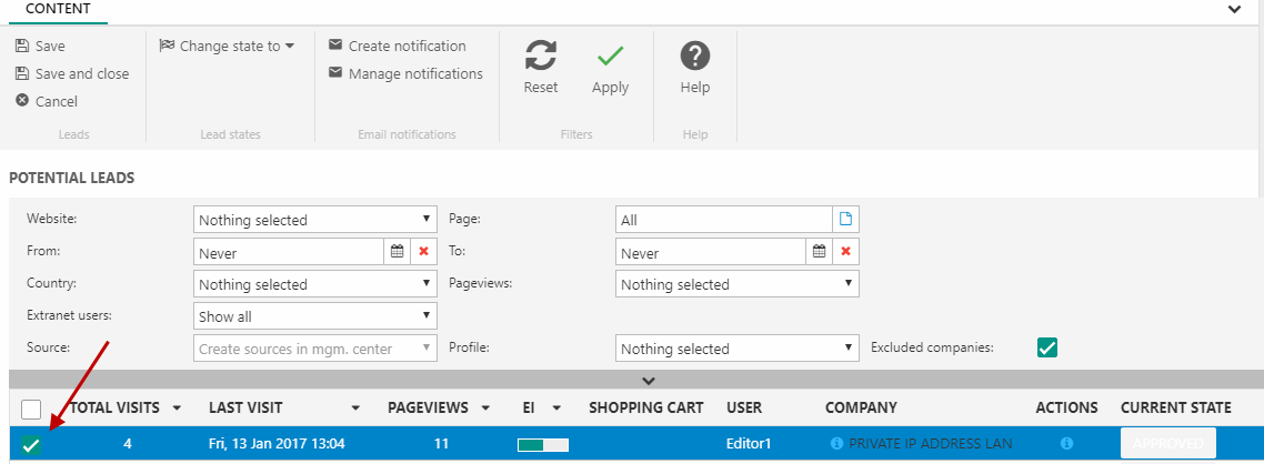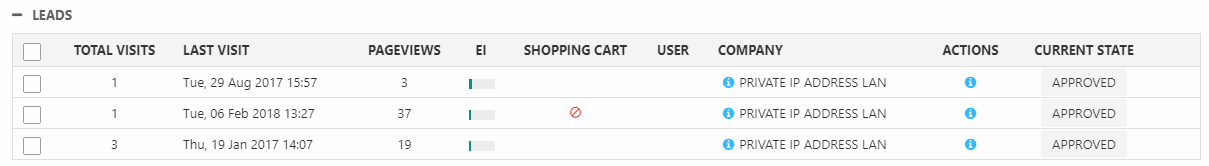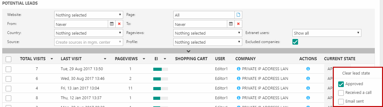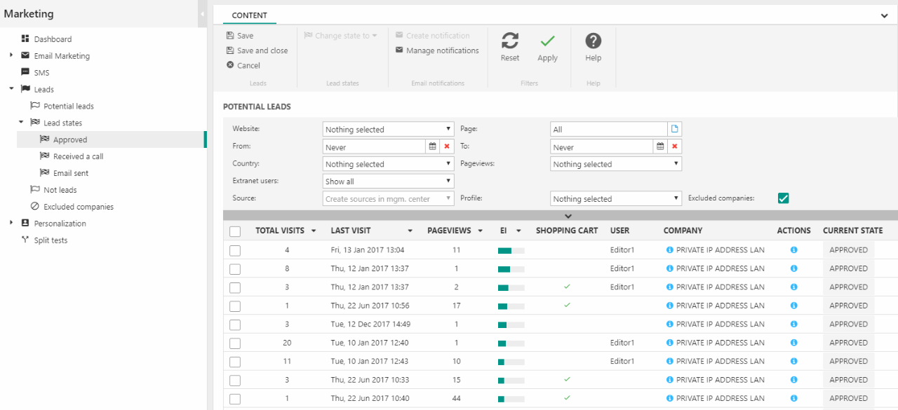 Click any lead state under Lead states in the Marketing tree to get an overview of the visitors you have marked as leads (Figure 4.1). They will be admitted to the Approved state by default.