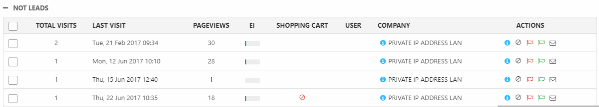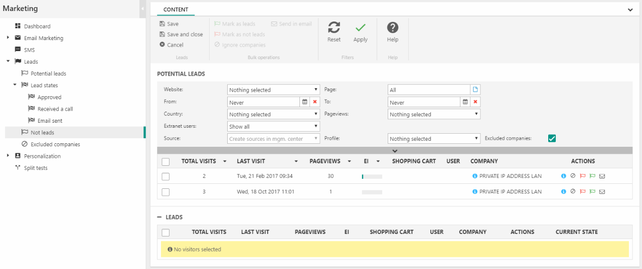 Click Not leads in the Marketing tree to get an overview of the visitors you have marked as not leads (Figure 6.1).