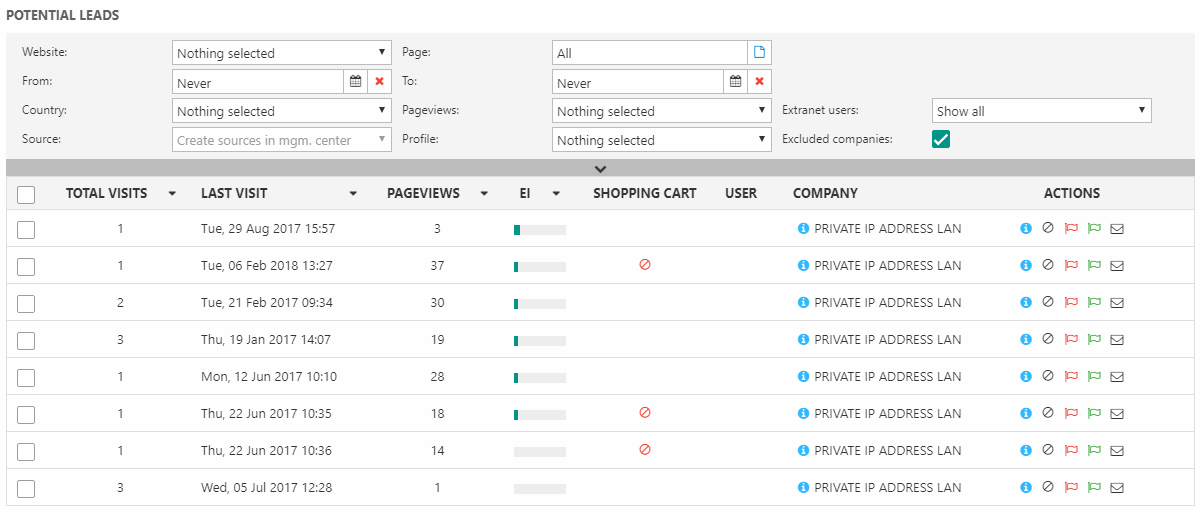 The Leads-tool is designed to support and enhance such marketing operations by monitoring visitor engagement, and flagging the most engaged visitors as potential leads. Engagement is measured by assigning an Engagement Index value to various actions, and collecting visitor statistics based on that.