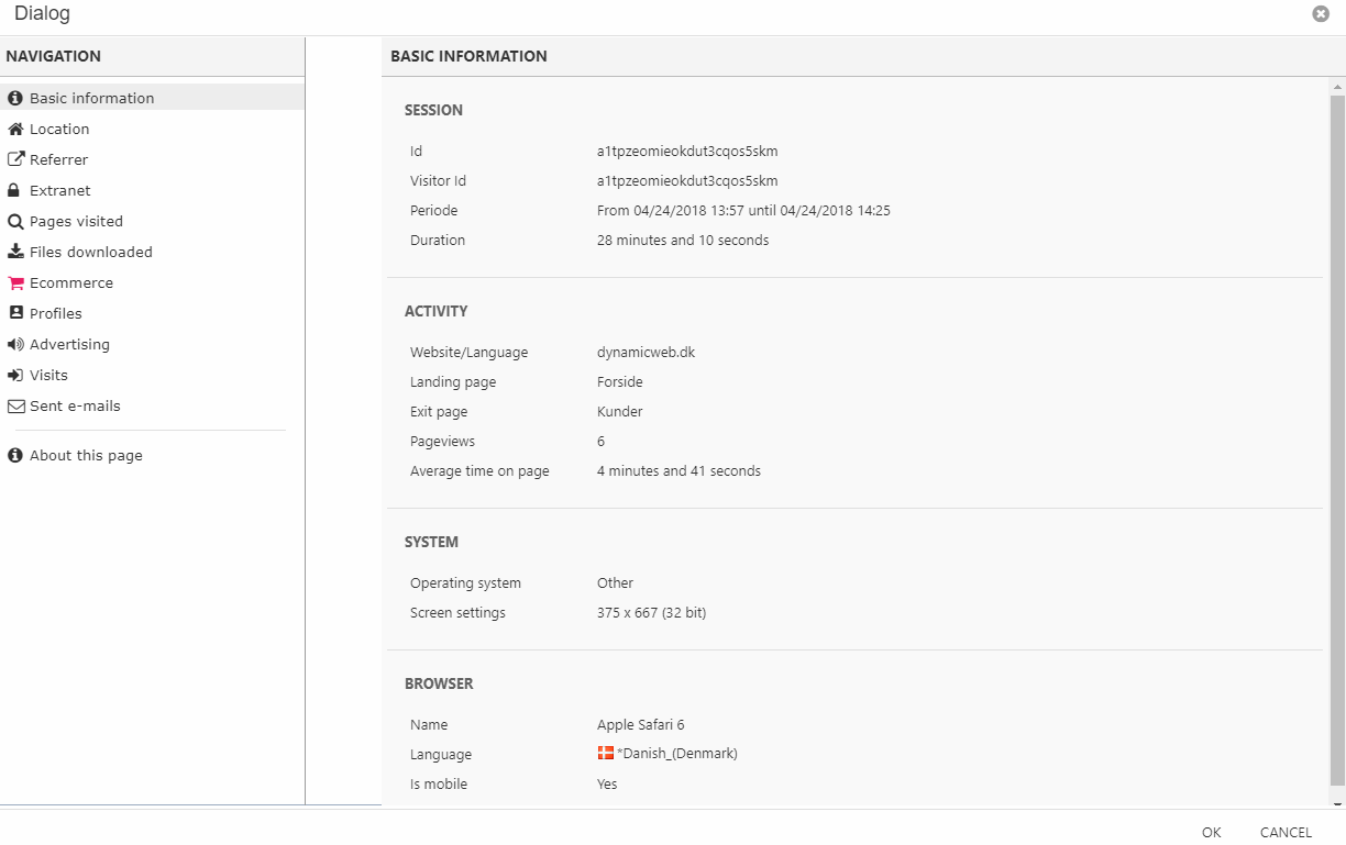 - Basic information about the session, such as duration, average time on page, operating system and browser info, etc.
