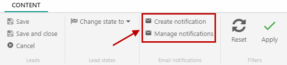 - Mark as lead – moves the selected leads to the Leads management window and, upon Save, to the Lead states category under the default lead state