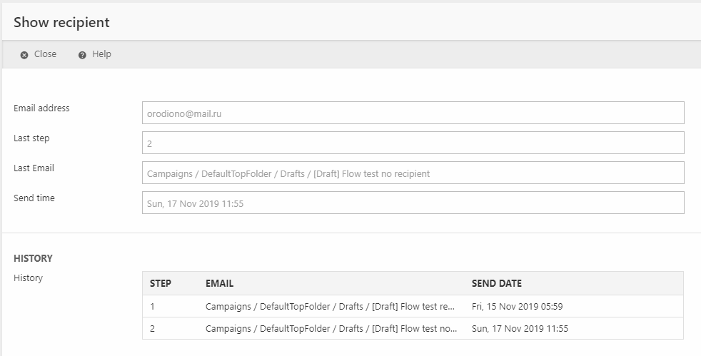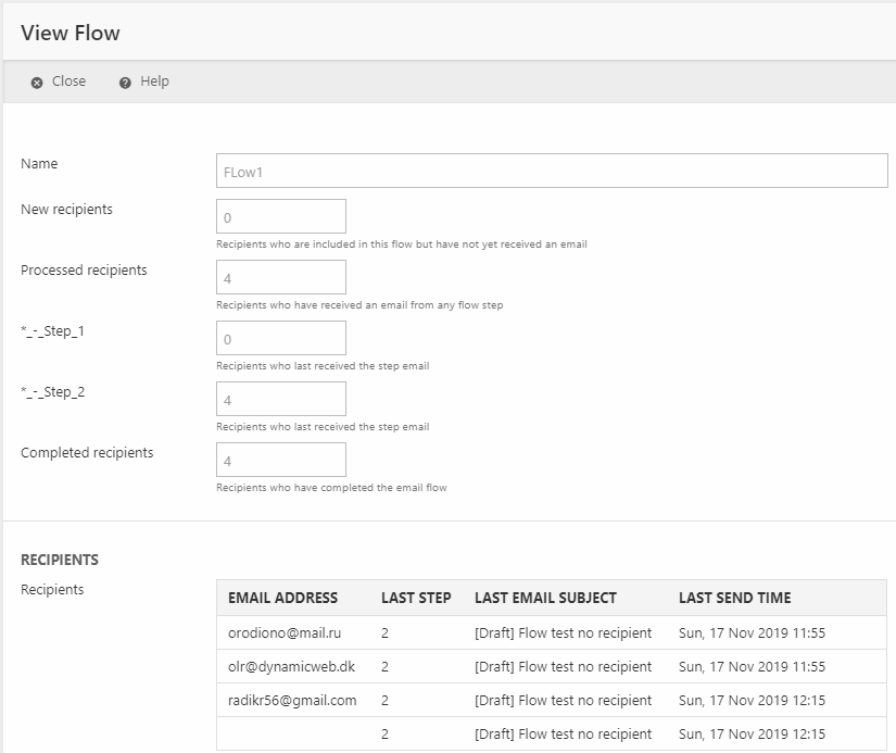 - A history of when the recipient was sent each email in this flow