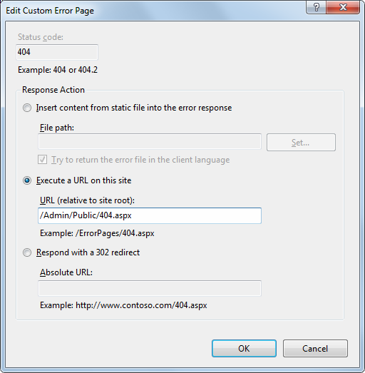 - Click on 404, and choose Edit from the Actions pane in the right side of the IIS manager. This opens the edit page (Figure 2.2).