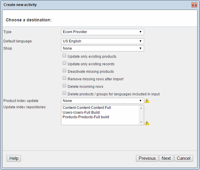 - Use the update index repositories selector to select one or more indexes to rebuild once an activity is run