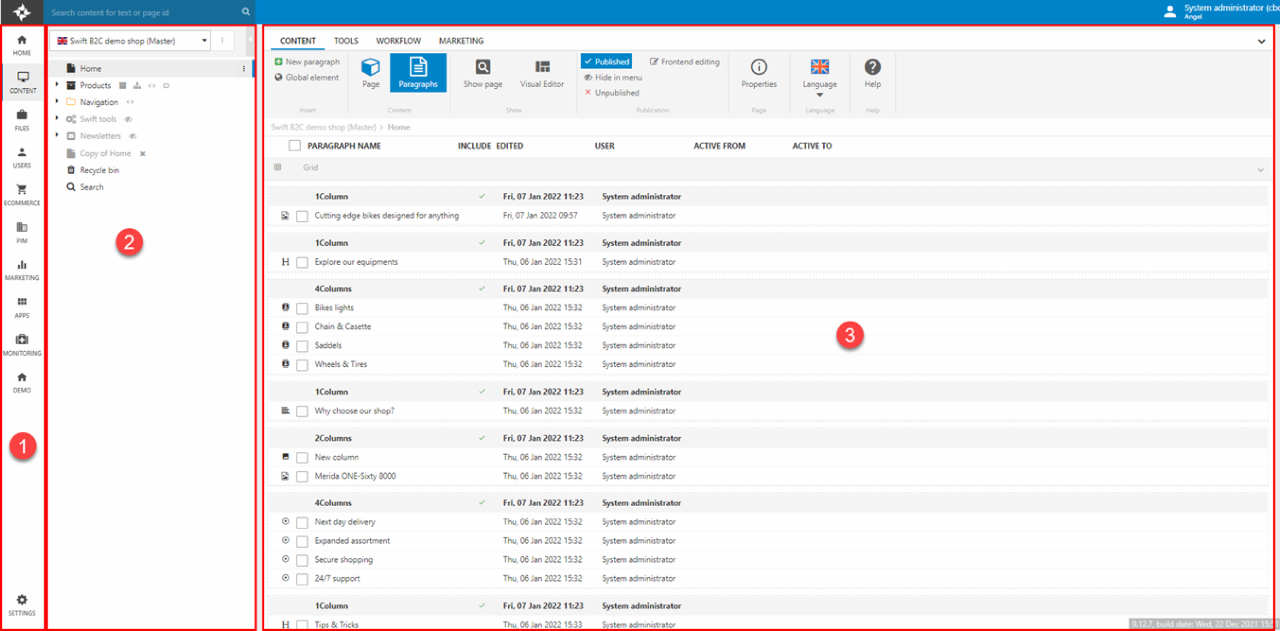 - A tree (2) which is used to structure and navigate between pages, folders, and tools like content search the recycle bin