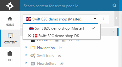 The content tree is a little bit different from other area trees, however, since it allows you to switch between different websites and language layers using the website selector (Figure 1.2).