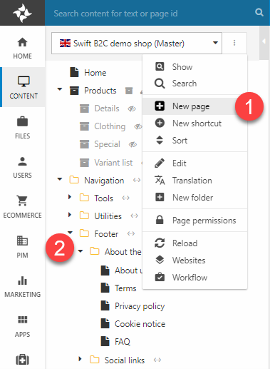 Pages are created by opening a context menu (1) and clicking New page. Pages may also be placed inside folders (2) – this makes it easy to create e.g., secondary navigation structures, hidden pages with feeds, or collections of newsletters which should not be reachable from the normal website navigation.