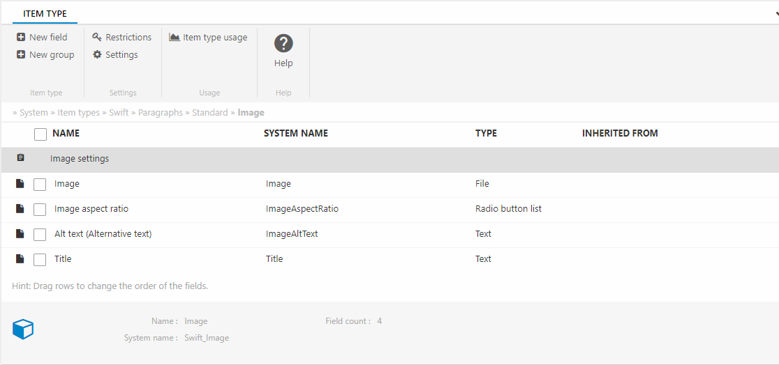 As an example of an item type, Figure 4.1 shows an item type called Image which is used on Swift solutions to add images to a page.