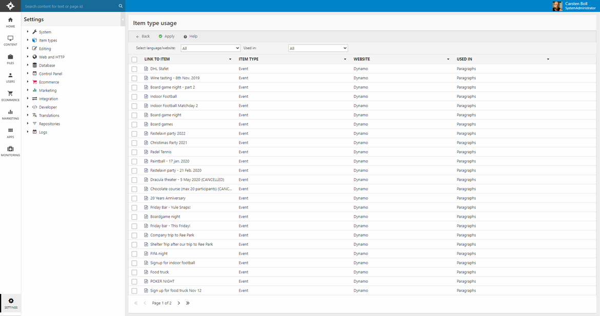 On solutions with item content, you can examine where an item is used by via the item type usage overview (Figure 4.2). This overview, which is available from the item type definition page and the item type list, shows all instances of an item type