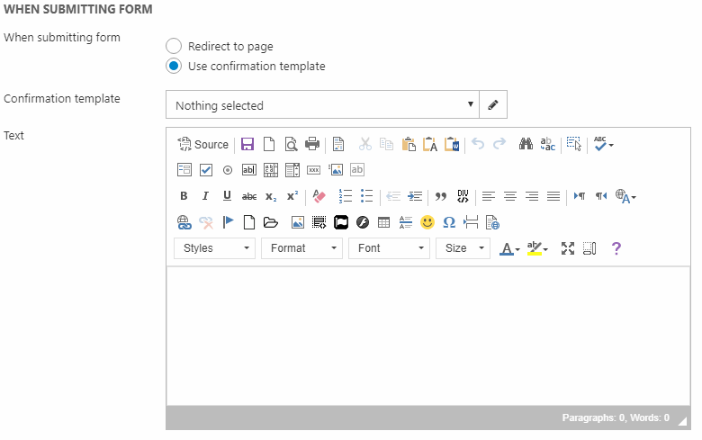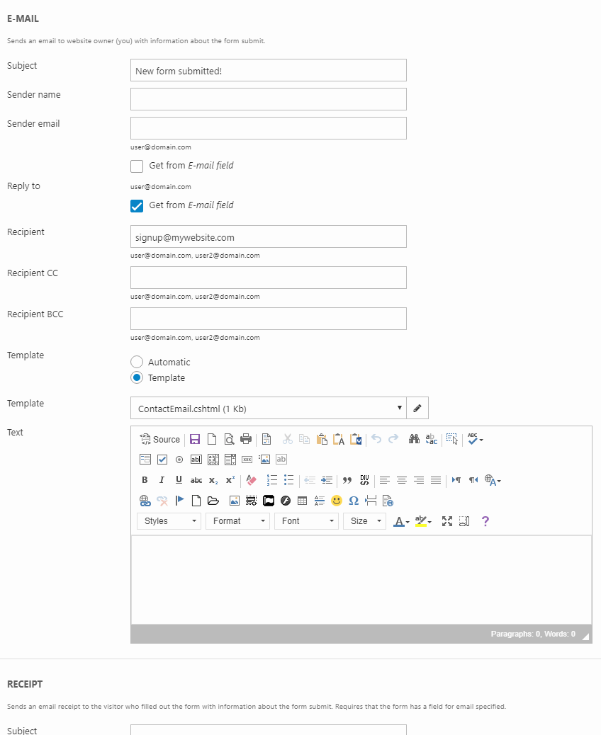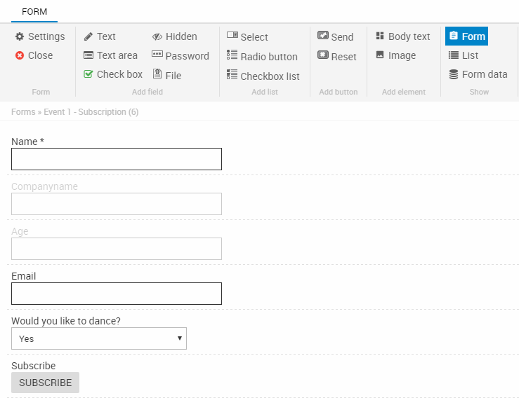 Forms are created and configured in the Dynamicweb administration, and then later added to a paragraph using the Forms for Editors app.