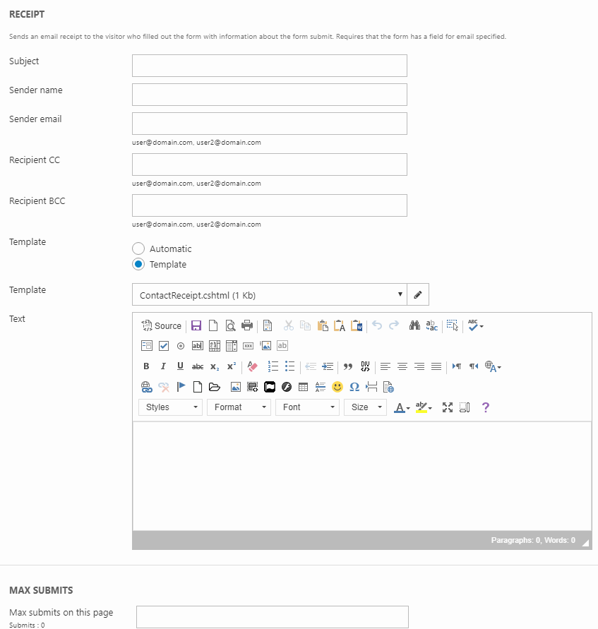 You can upload several files to the same field by naming the additional input controls “FileFieldSystemName_{N}”. Files are saved to the /Files/System/FormUploads/Form-Name/ folder. Some file extensions are not allowed, e.g. .cshtml, .aspx and similar, and filenames are automatically cleaned of illegal characters. |
