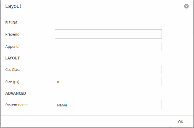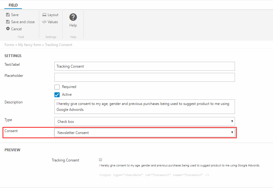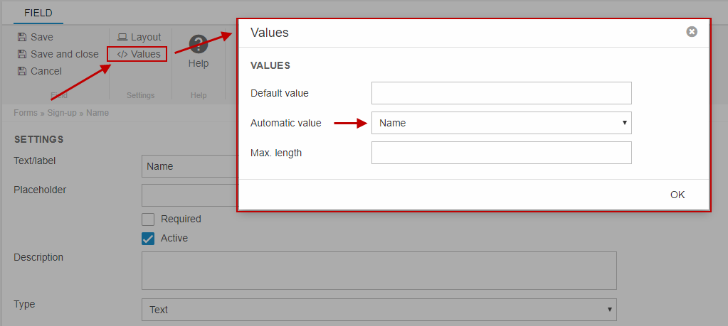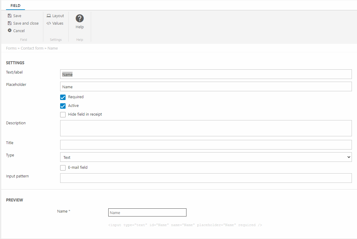 When editing a field, you can use the Layout and Values tools to set up more advanced behaviors.