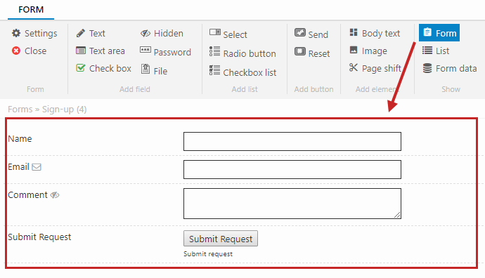 So forms are created from the Dynamicweb administration interface, and then published to a paragraph using the Forms for Editors paragraph app.