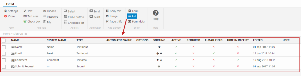 Form mode is useful because it shows you an approximation of how this form will be rendered in frontend - but in some cases you may need to change the view to list-mode (Figure 4.2).