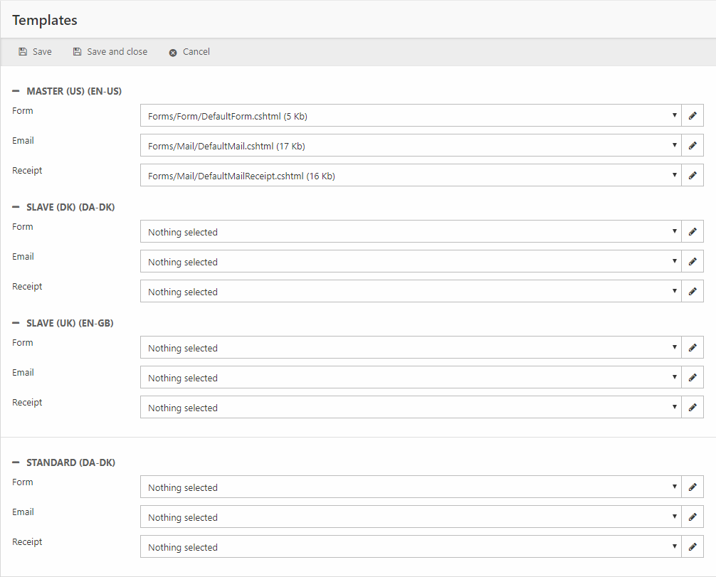 Using this interface, you can select or create website-specific templates to use when a user selects the Automatic option in a forms for editors app.