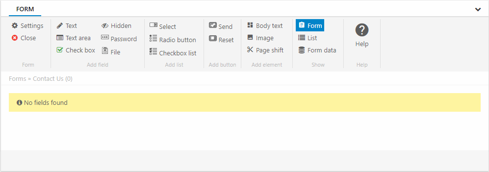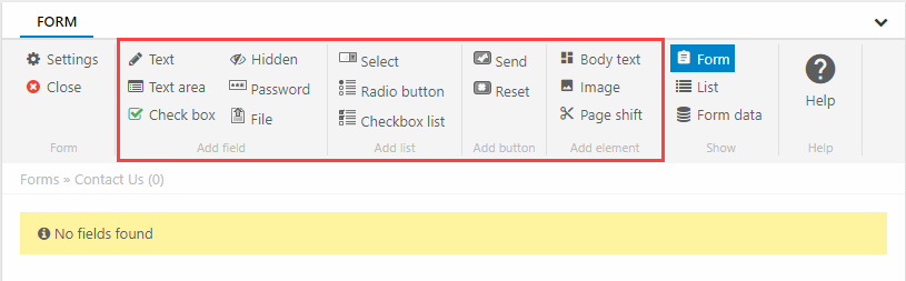 When viewing or editing a form you can use the ribbon bar buttons (Figure 3.1) to add fields to it - these are the fields which the user will fill inand submit in frontend.