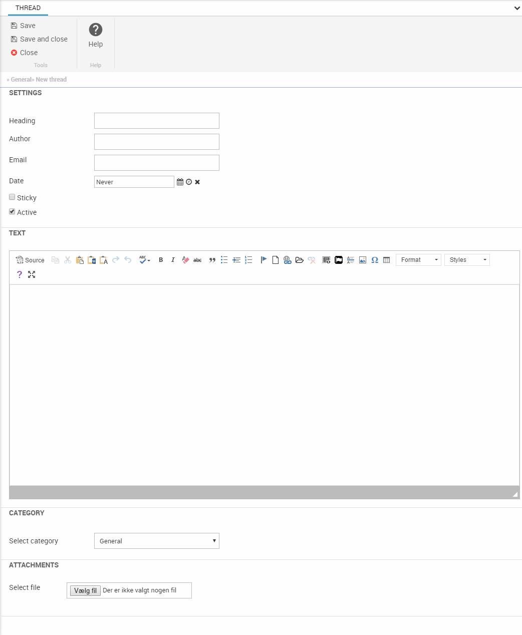 From here, you must fill in the details of the new thread – heading, author, e-mail (of author), date of publication, etc. – before saving it using the toolbar.