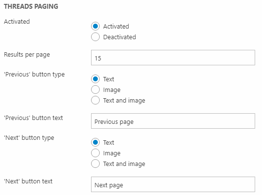Unless your forum fails to engage your users, you will eventually end up with a lot of threads. To make things manageable, use the threads paging settings (Figure 5.2).
