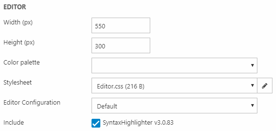 - Include custom plugins – currently only a syntax highlighter is available, which highlights code when using the insert code block button in an editor