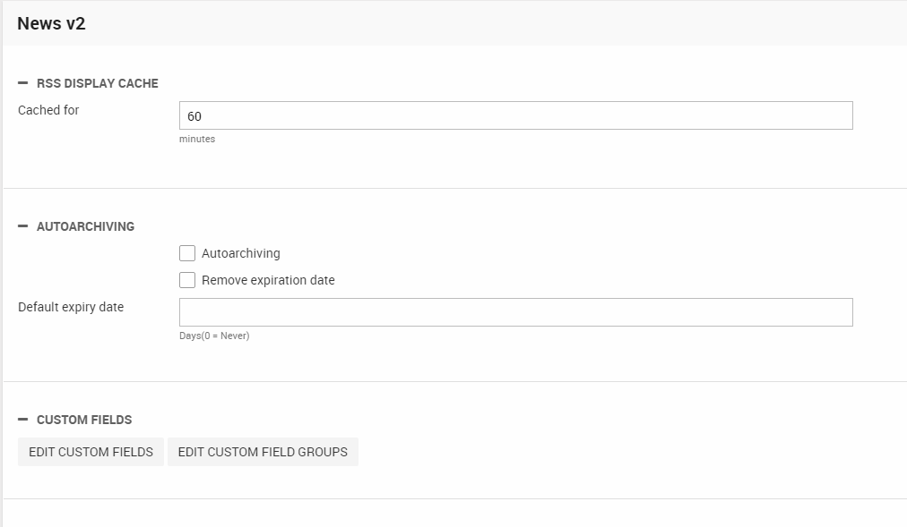 - Toggle and configure auto-archiving – check remove expiration date to be able to show an archive on the frontend, and set a default expiry date in days