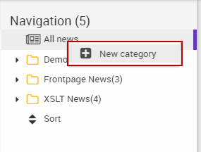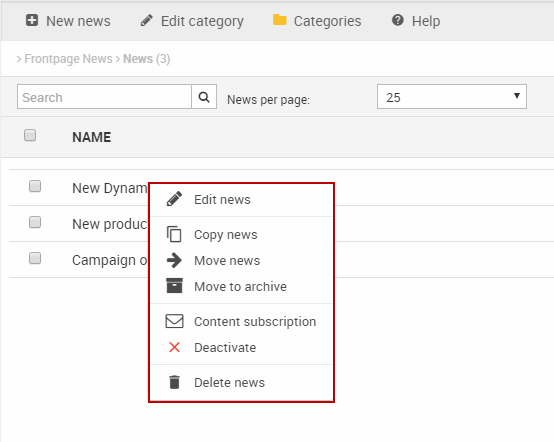 - The content panel on the right, where news articles under the selected category are listed – and can be created or edited