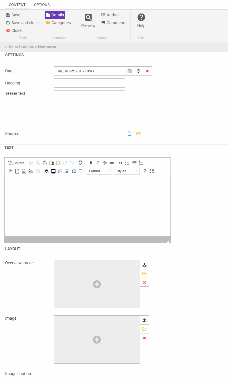 The backend News area allows you to create and manage categories, articles and layout templates from the backend.