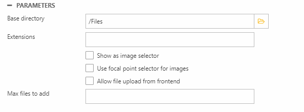 A File field is used to render a file or image selector of some sort - it comes with a set of extra parameters which allow you to tweak how it behaves (Figure 1.1)