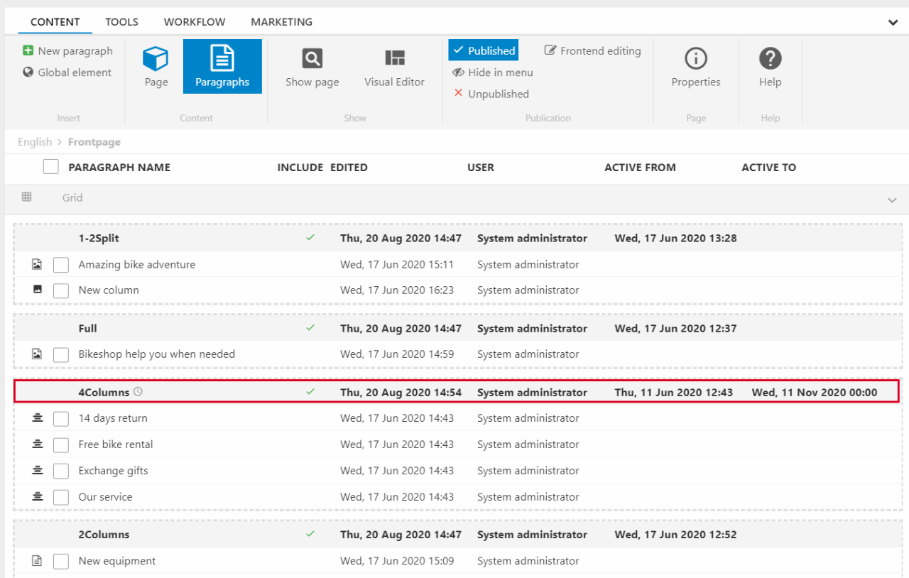 The paragraph list for content pages looks a bit different and you have some new options. First off, the content is divided into their individual rows and each row is bordered with dashed lines. For each row, you have a greyed-out line at the top with row information displaying: