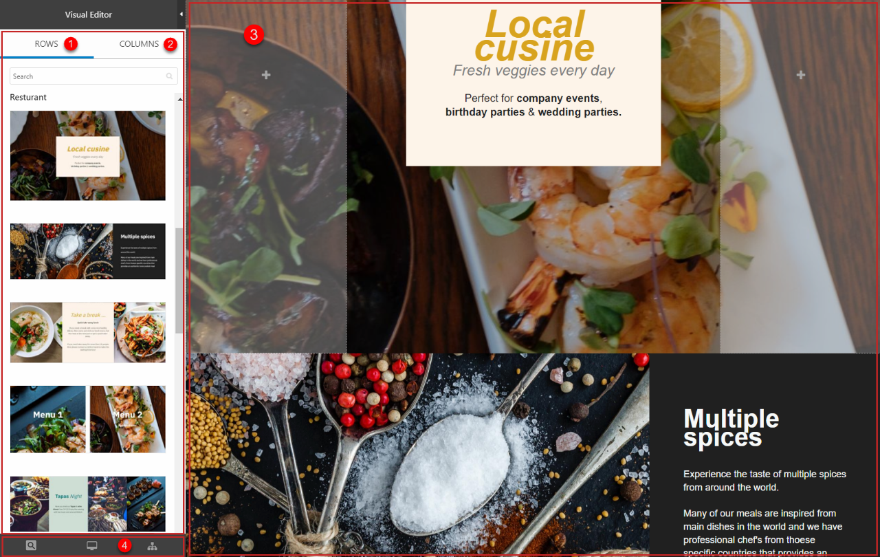 Visual Editor is a tool in Dynamicweb empowering the user to create content in a visual way, by having the page as the workplace (3) and then dragging different building blocks – predefined rows (1) and columns (2) – onto it. In this way, the user can immediately see what the finished page would look like in frontend.