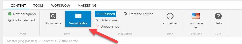The Visual Editor function as a special view inside the Dynamicweb administration (backend), available on all pages using a template which has been configured to use the visual editor. In a way you can consider it as an alternative view of the paragraph list we’re all used to working with (Figure 1.2).