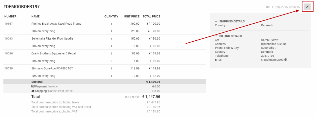 To edit an order, click the edit button in the order details view (Figure 9.1).