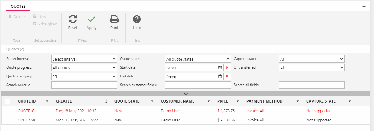 - Filter on quote state (custom work-flow states), quote progress (system controlled) or capture state (depending on payment provider details)
