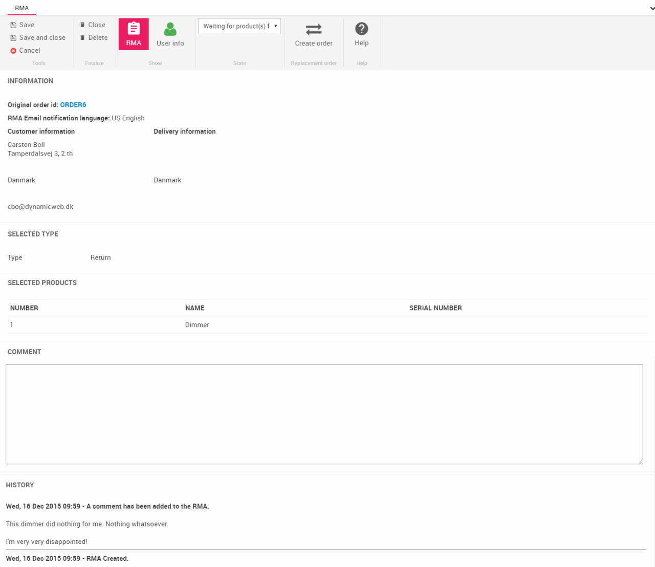 RMA states are custom states for controlling your RMA process. A Dynamicweb solution is born with a number of default states, such as ‘Waiting for product(s) from customer’, ‘Rejected’ and ‘Sent for repair’ – but you can easily create new RMA states