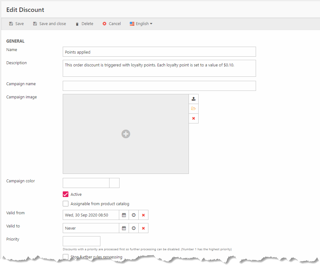 • In the triggers sections you don’t need to change anything by defauly, but if you have separate currencies on the solution you should create separate loyalty point discounts each currency and then use the Product Catalog > Language section to specify which language this particular discount should be available for.