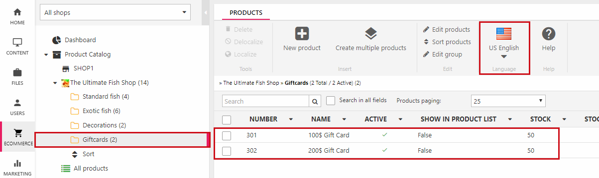 For example, your default language is US English and you have a product group called Gift Cards with two products in it (Figure 2.2). You then switch the language context.