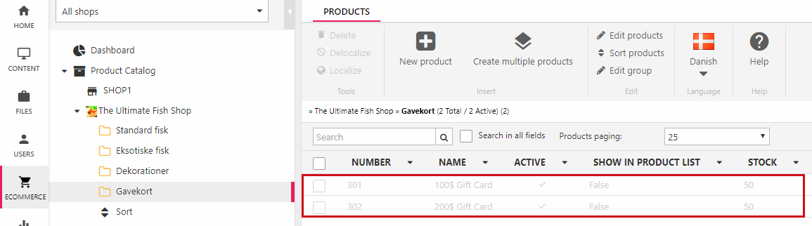 Once the language context has been switched to Danish, any products and product groups existing in your default language (Figure 2.3) will now appear greyed out – this is because they are not localized yet.