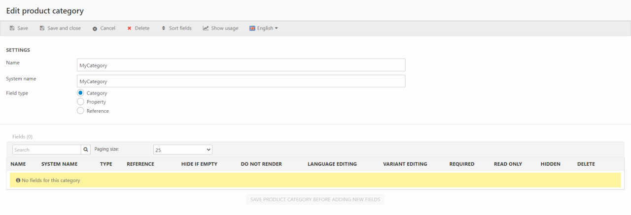 Once the category has been saved, you must add at least one category field to it. To create a product category field click Add new field and fill in the field settings (Figure 1.2).