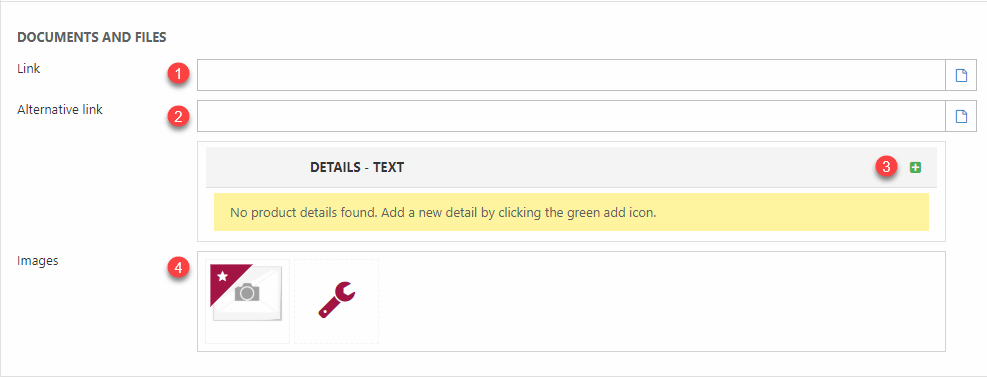 The Documents & Files fields allow you to associate one or more links, files, images or texts with the product (Figure 2.3).