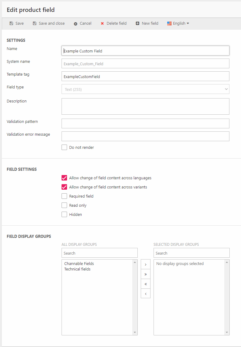To create a custom product field click New field in the toolbar to open the field properties (Figure 6.2)