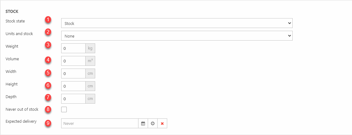The Stock fields (Figure 5.1) concern the dimensions, and availability of the product.