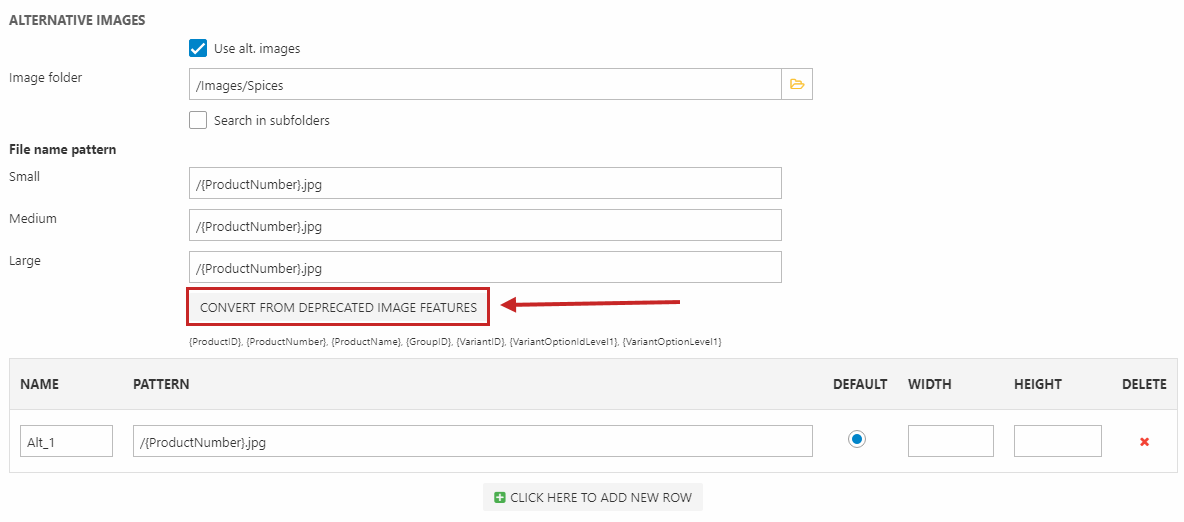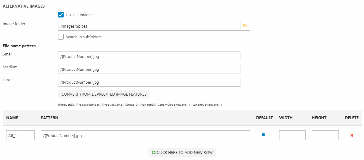 The third option for matching products and images is using Images Patterns – also sometimes known as alt. images. Image patterns automatically assign images to a product based on one or more patterns – e.g. /{ProductNumber_Small.png) and a folder where the images must be located. As such, image patterns presuppose that images are named consistently and in a way which can be tied to the product, e.g. using the product number or an external ID.