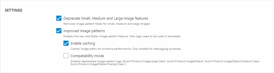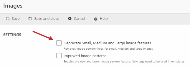 After moving and/or converting existing patterns, go to Settings > Ecommerce > Advanced configuration > Images and check Deprecate Small, Medium and Large image features then save (Figure 6.2).