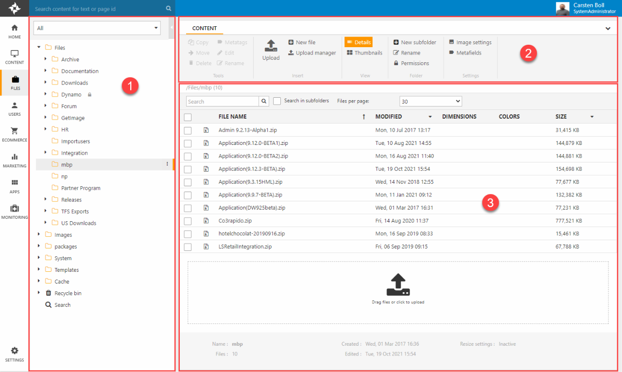 Like other areas, the Files area is accessed via the area menu and consists of a tree (1) where you navigate between folders, a toolbar (2) with various tools, and a content area (3) where you view and work with files.